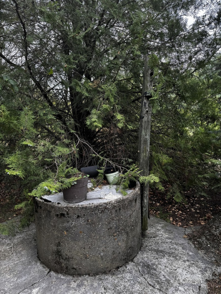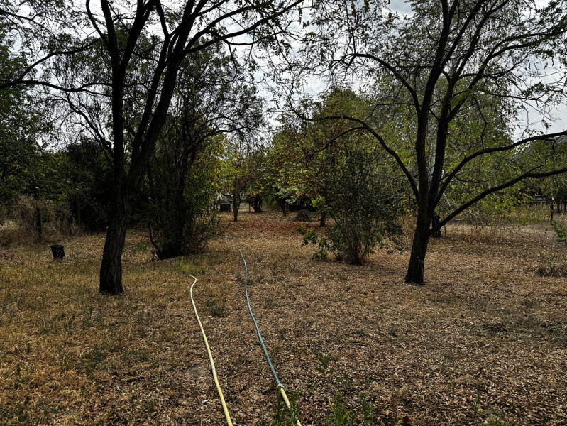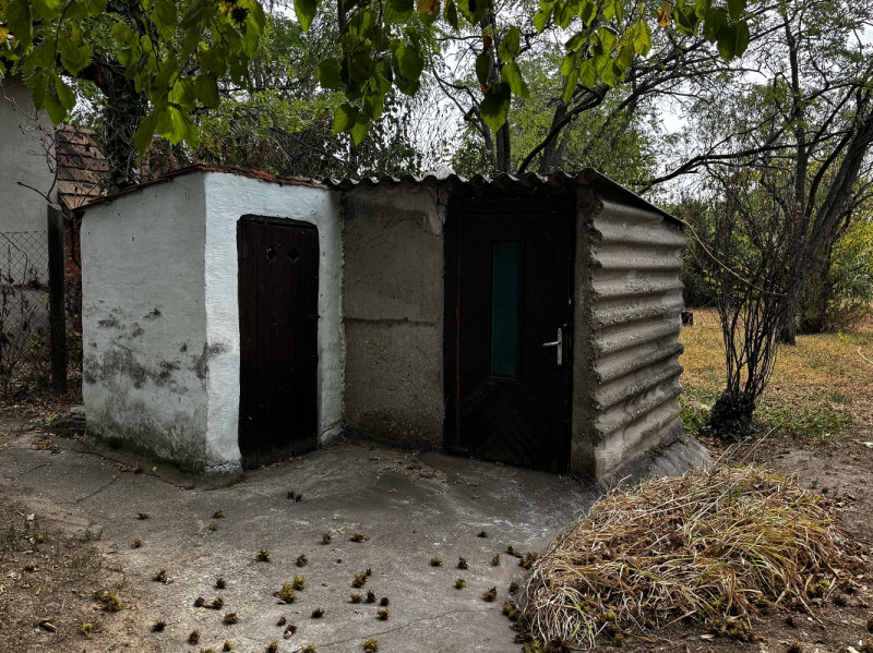 A füvesített udvar gyümölcs/fákkal beültetett, ahol melléképületek és ásott kút található.