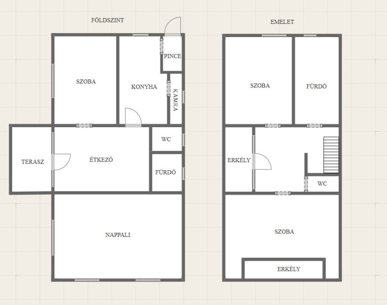 A földszinten egy 32 m²-es nappali, egy külön nyíló szoba, tágas konyha, étkező, kamra, fürdőszoba és külön mellékhelyiség került kialakításra. A konyhából közvetlen lejárat vezet a 30 m²-es pincébe, ahol a kazánok is helyt kaptak.