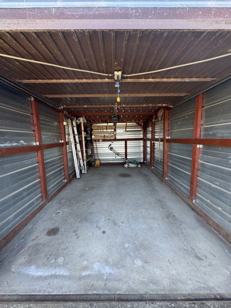 Az udvaron egy lemezgarázs kapott helyet, amely egy személyautó számára biztosít fedett beállási lehetőséget, kapuja elektromos vezérléssel működtethető.