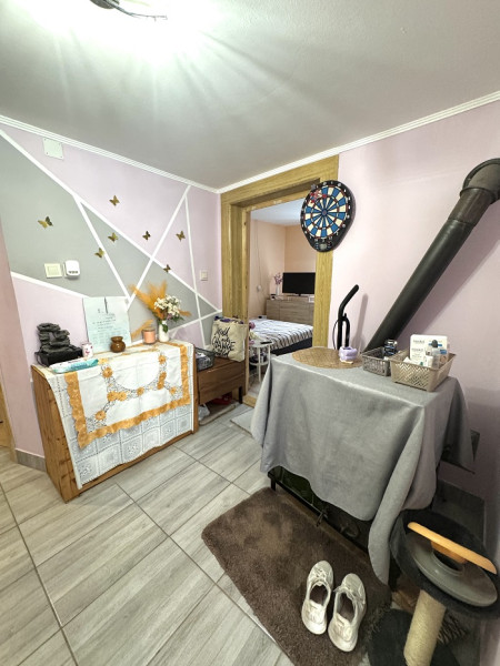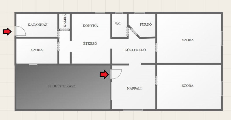 Az ingatlan fedett teraszon keresztül közelíthető meg, ahonnan a nappaliba lépünk. Innen nyílik egy szoba. A nappalihoz kapcsolódó közlekedőből további helyiségek érhetők el: szoba (2), fürdőszoba, különálló WC, valamint egy konyha-étkező. A ház hátsó részében egy félszoba és kamra is kialakításra került, továbbá itt található a kazánház, amely kívülről és belülről is megközelíthető.